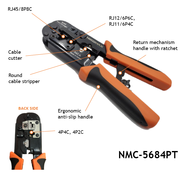 NMC-5684PT is designed for crimping RJ45 / 8P8C, RJ12 / 6P6C, RJ11 / 6P4C, 4P4C and 4P2C type plugs. But its main specialization is PT Plugs: the tool crimps the plug and cuts the wire excesses at the same time.